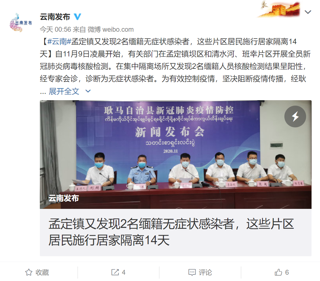 昨日(10日),云南省临沧市耿马傣族佤族自治县召开新闻发布会,通报耿马县新冠肺炎疫情防控工作有关情况,回答记者提问。近日,耿马县孟定镇发生了1例缅甸输入无症状感染者。自11月9日凌晨开始,在孟定镇坝区和清水河、班幸片区开展全员新冠肺炎病毒核酸检测。在对上述地区开展全员核酸检测中,在集中隔离场所又发现2名缅籍人员核酸检测结果呈阳性,经专家会诊,诊断为无症状感染者。对新增的2名缅籍无症状感染者,正开展流行病学调查,对其密切接触者进行隔离医学观察,对重点场所进行全面消杀。