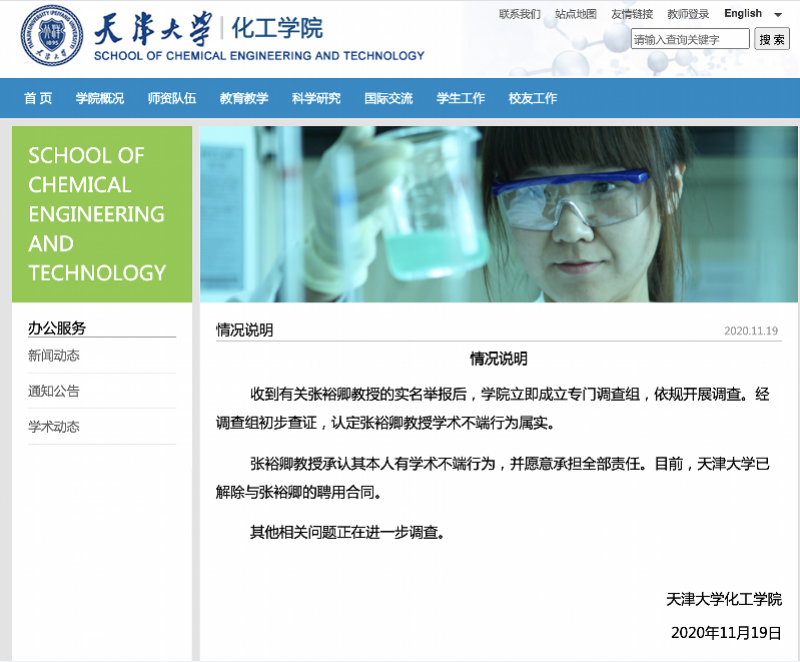 11月19日晚,天津大学化工学院发布《情况说明》宣布与该学院存在学术不端行为的张裕卿教授解除聘用关系。