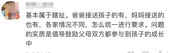 我觉得这个建议挺好,虽然对于有些家庭来说,爸爸接送已经是日常,这对他们来说是形式,但爸爸以忙应酬为理由,退出家庭的位置还是占大多数的,且还有很大一部分男性以接送孩子,带孩子为羞耻,认为这是女人的事情,觉得男人就是要出去赚钱,我觉得可千万别指望这部分男性能够醒来,这种建议就是针对这种男性的,矫正他们的认知,去病化很重要。 另外,其实在很多的的家庭结构中,爸爸是被家庭排除在外的,妈妈和孩子的关系比妈妈跟爸爸的关系都更亲密,爸爸基本不参与家庭活动,爸爸想插进来就很难了,孩子取代爸爸的位置,畸形的家庭结构就这样形成了。 其中一种是,有的爸爸想参与,但孩子和妈妈关系太紧密了,参与不进来,于是就彻底退出了。 还有一种是,爸爸想参与进来,但妈妈仇恨爸爸,于是爸爸就暴力参与,打孩子骂孩子,刷存在感,这种结构是是非常糟糕的 当然,如果一个学校,爸爸接送已经是普遍现象,也根本不需要这样的建议,没有爸爸接送的同学看到有爸爸接送的同学,回去后自然提要求。