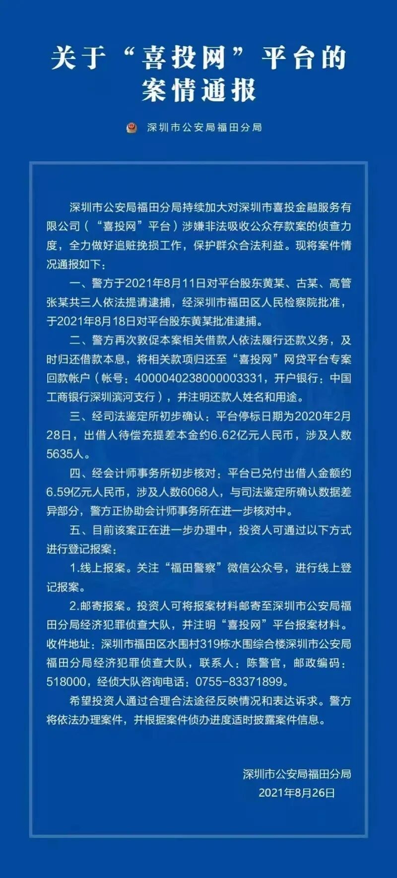 8月26日,深圳市公安局福田分局发布关于“喜投网”的案情通报,其中提到,福田警方于8月11日对平台股东黄某、古某、高管张某三人依法提请逮捕,经深圳市福田区人民检察院批准,于8月18日对平台股东黄某批准逮捕。