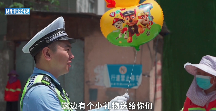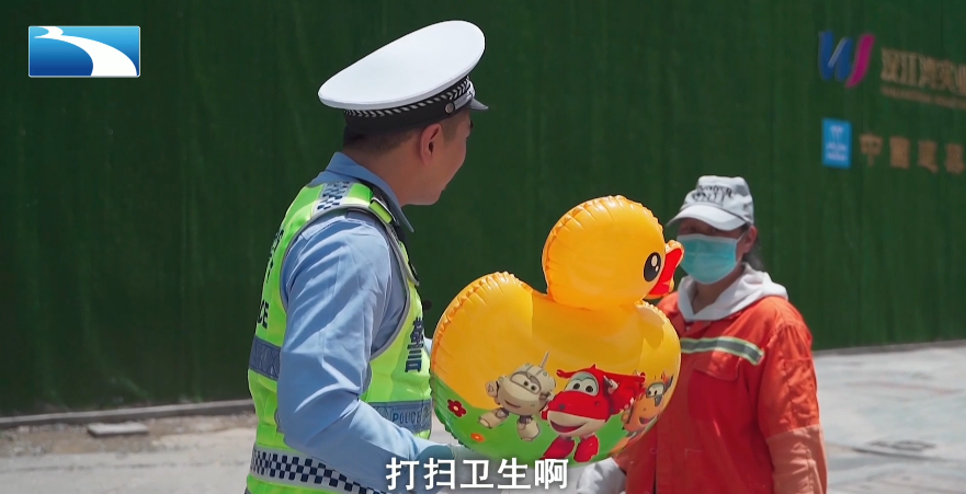 刚处理完一起违规行为,民警吴鸿浩又看到环卫工人正在工作,手中的气球作为礼物,吴鸿浩就送给了环卫工人。
