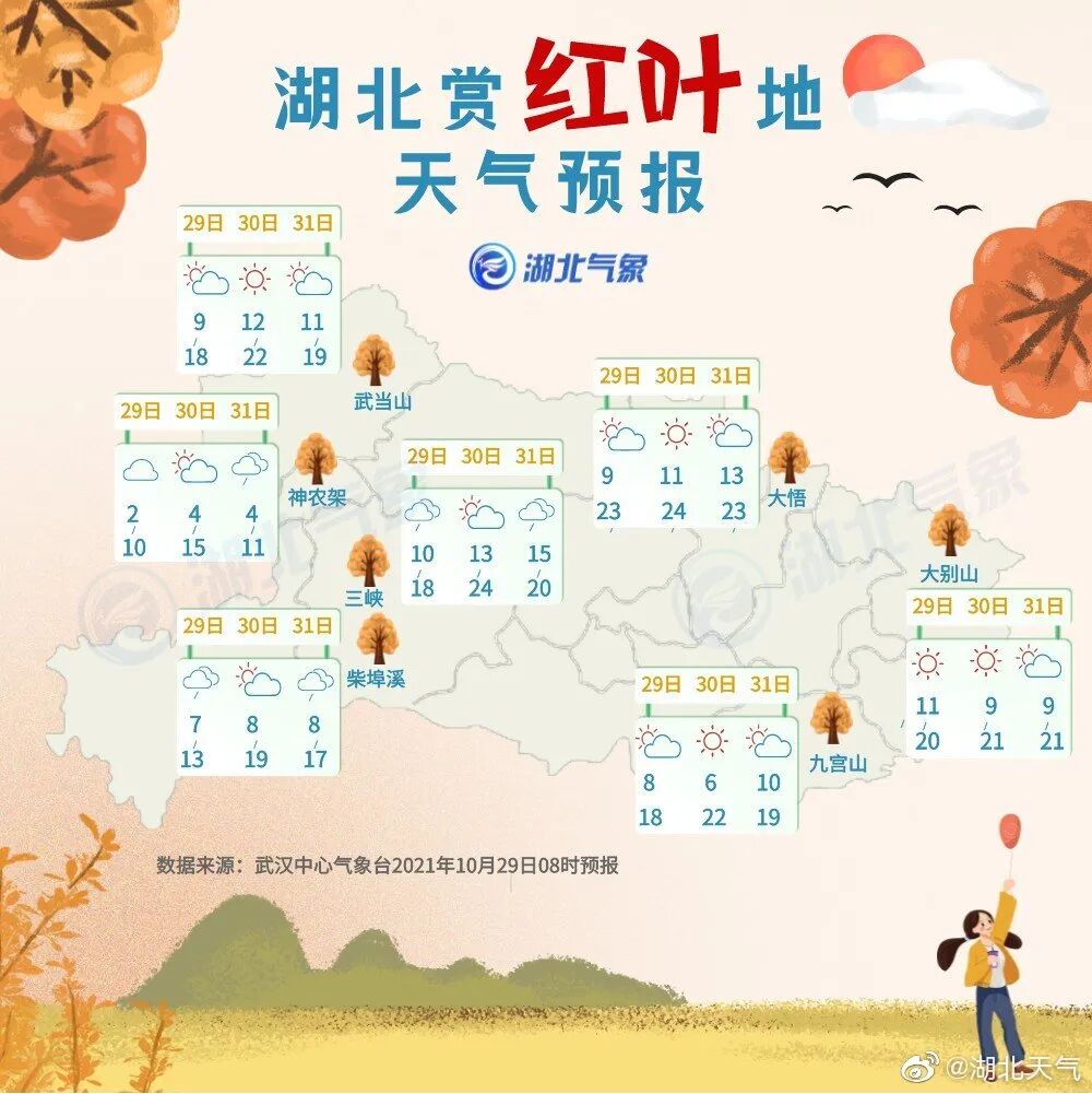 每年10月下旬到11月中旬是湖北红叶的最佳观赏期。这个周末湖北天气晴暖依旧,湖北省内红叶渐入佳境,适宜登山赏秋。今年秋天在湖北哪些地方能赏红叶?气象部门介绍,湖北赏红叶还是要看神农架、武当山、宜昌三峡、五峰柴埠溪、大悟、罗田大别山,那里的红叶美得浓郁,令人印象深刻。