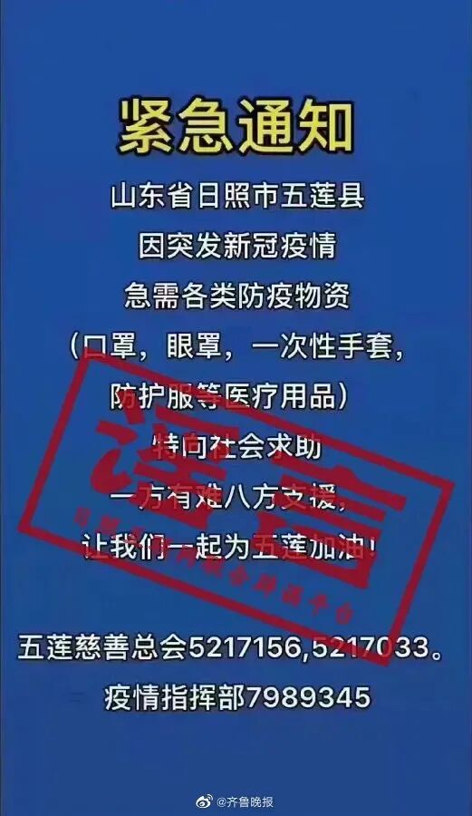 10月28日下午,网传一份《紧急通知》,称山东省日照市五莲县防疫急需各类物资。经向相关部门核实,此信息为谣言。