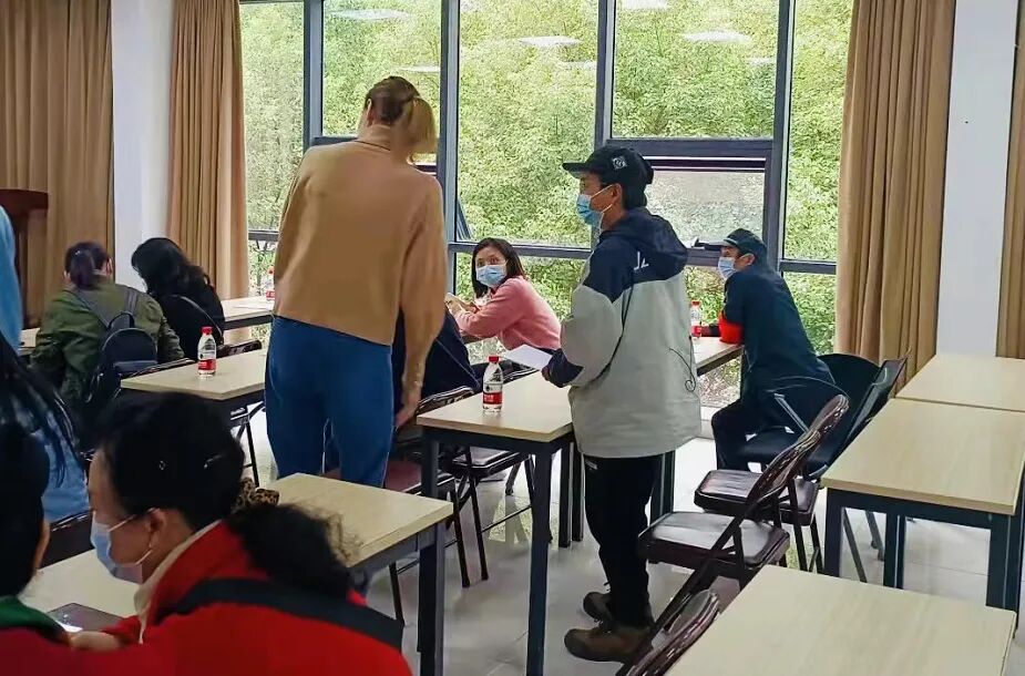 10月26日上午,武汉市武昌区水果湖街道机安社区志愿服务角,20余位老年居民在社区工作者和志愿者的带领下练习中英口语,交流文化习俗,培养国际视野,结交深厚友谊。