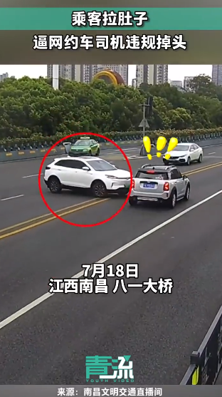 近日,在江西南昌,一名乘客拉肚子,网约车司机在大桥上违规掉头。
