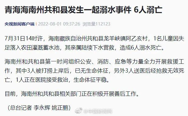 7月31日14时许,青海海南藏族自治州共和县龙羊峡镇阿乙亥村,1名儿童因失足落入农田灌溉蓄水池,其亲属陆续下水营救,造成6人溺水死亡。