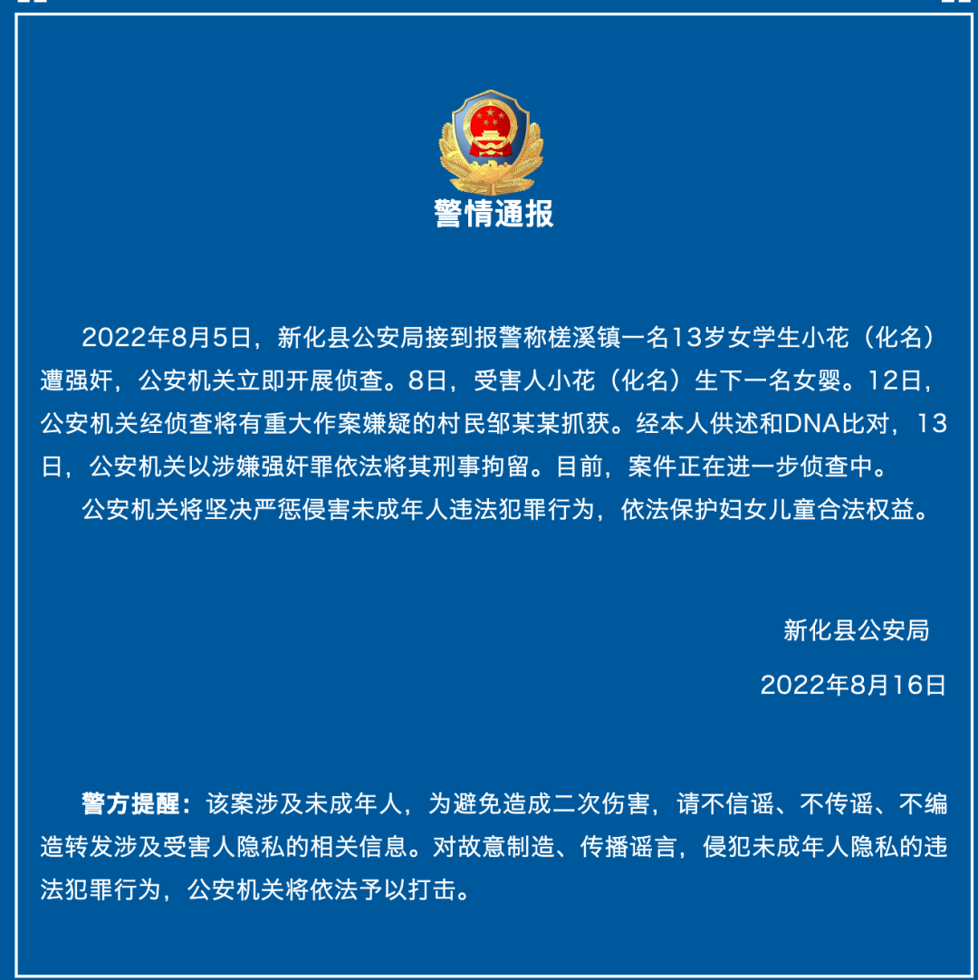 8月16日,据湖南新化县公安局通报:2022年8月5日,新化县公安局接到报警称槎溪镇一名13岁女学生小花(化名)遭强奸,公安机关立即开展侦查。8日,受害人小花(化名)生下一名女婴。12日,公安机关经侦查将有重大作案嫌疑的村民邹某某抓获。经本人供述和DNA比对,13日,公安机关以涉嫌强奸罪依法将其刑事拘留。目前,案件正在进一步侦查中。