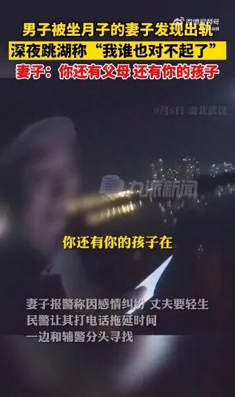 近日,湖北武汉一名男子被坐月子妻子发现出轨跳湖轻生,妻子劝解“你还有父母和孩子”。