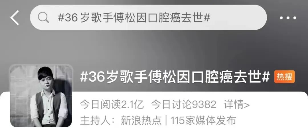 9月10日,歌手傅松因口腔癌去世,终年36岁。傅松曾在其社交平台上表示,自己的口腔癌系槟榔所致,呼吁大家“珍惜生命,远离槟榔”,其朋友表示,他第一次病发后还嚼过几次槟榔,生命最后醒悟,劝诫大家不要有侥幸心理。(此前报道:男歌手患癌去世,年仅36岁!曾劝网友远离这种零食)![]()