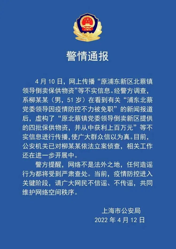 4月10日,网上传播“原浦东新区北蔡镇领导倒卖保供物资”等不实信息。经警方调查,系柳某某(男,51岁)在看到有关“浦东北蔡党委领导因疫情防控不力被免职”的新闻报道后,虚构了“原北蔡镇党委领导倒卖新区提供的四批保供物资,并从中获利上百万元”等不实信息进行传播,使广大群众信以为真。