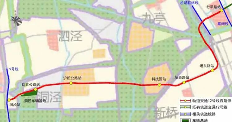 地铁12号线西延伸(洞泾站——七莘路站),途经松江区、闵行区。线路主要走向为:沈砖公路—莘砖公路—莘松路—北竹港—小涞港—顾戴路。