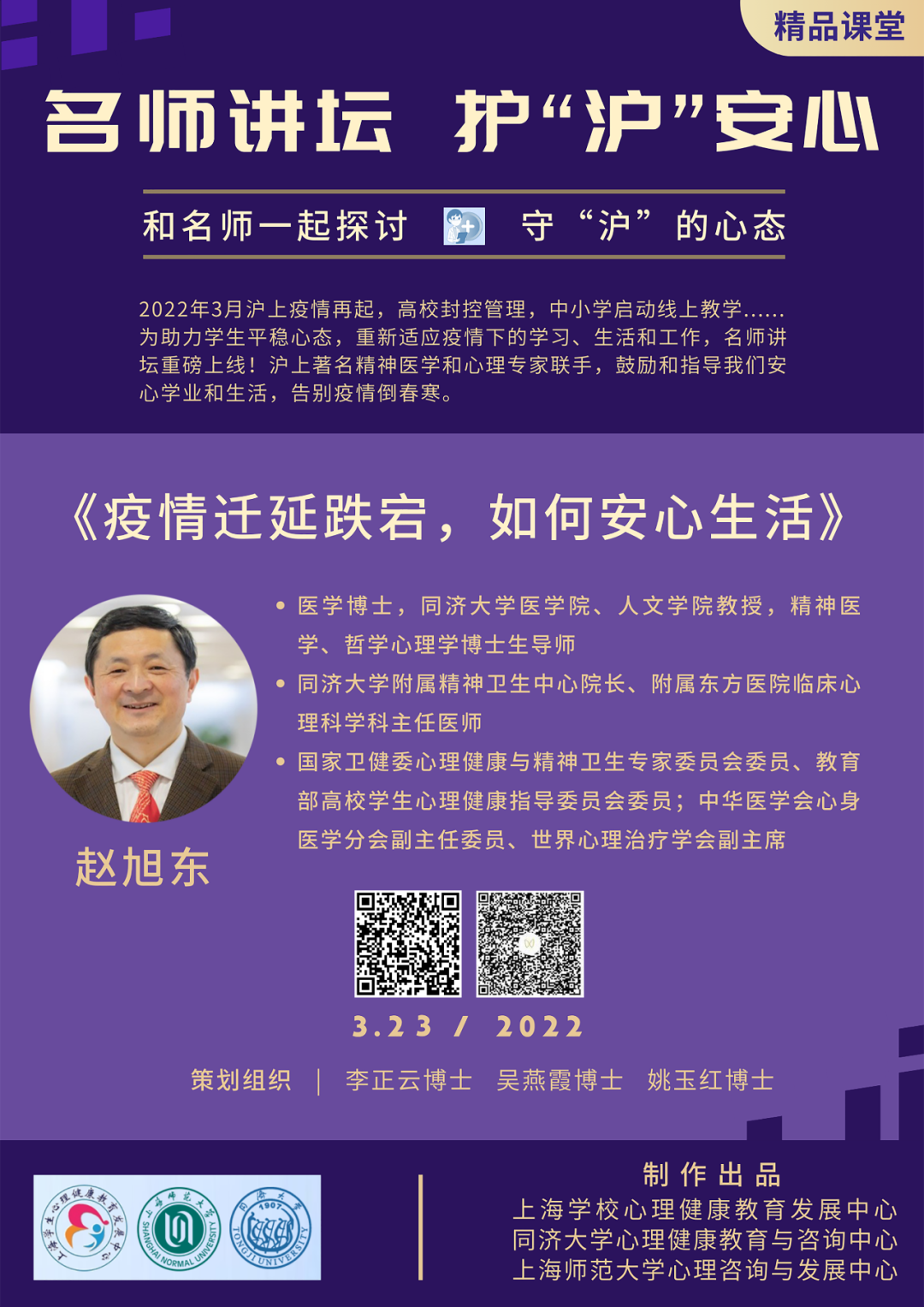 来自同济大学的精神医学和心理学双博导赵旭东教授,回顾抗疫两年来的心路历程,结合近期心理老师从一线发来的工作汇报,简要梳理各种在疫情压力应激反应中出现的心理体验、躯体状况和成长经验,从心理健康促进、心理创伤疗愈的角度,奉献临床医生的爱心与智慧。