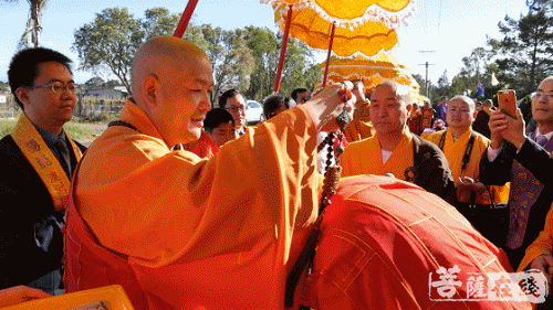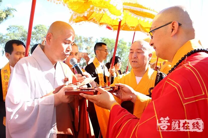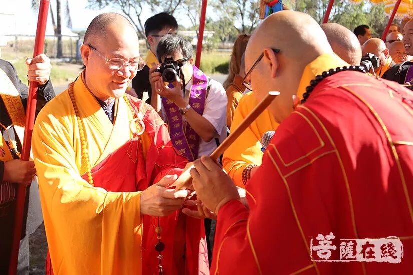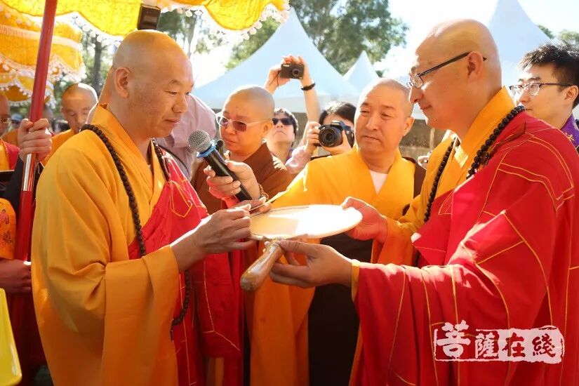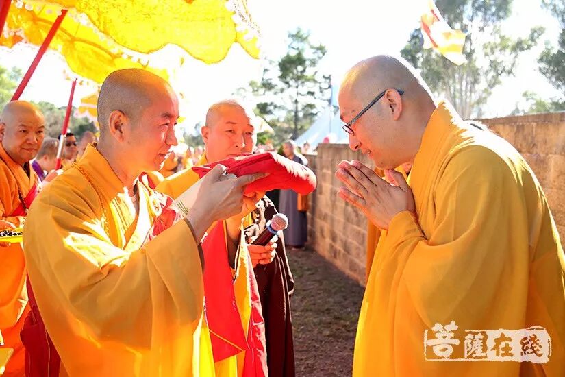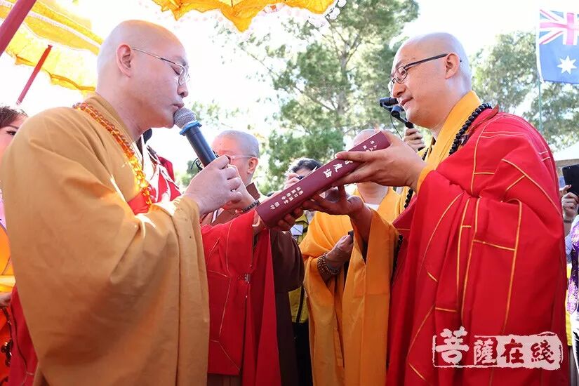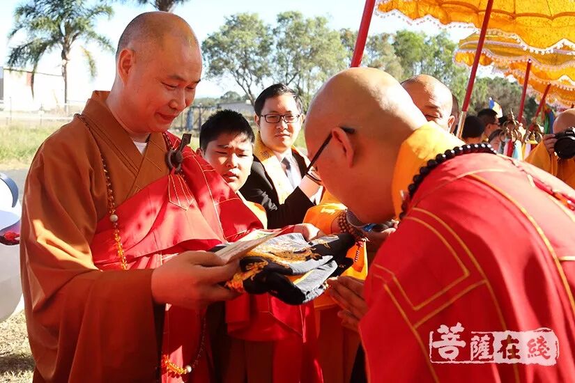 悉尼时间上午9时(北京时间上午7时),两序大众跟随仪仗队的引领,排班迎请般若法师至山门口就位。诸山长老分别立于法宝旁,般若法师依次礼请厦门南普陀寺首座、南普陀寺慈善基金会副会长慧然法师授祖衣;中国佛教协会副秘书长、北京灵光寺方丈常藏大和尚授挂珠;中国佛教协会副秘书长、兰州报恩寺住持普正大和尚授卧具;中国佛教协会副秘书长、江西云居山真如禅寺方丈纯闻大和尚授佛像;中国佛教协会常务理事、福州开元寺方丈本性大和尚授戒尺和锡杖;江西省佛教协会副会长、赣州市寿量古寺方丈瑞印大和尚授比丘戒本;美国纽约瑞光寺住持瑞法大和尚授法轮;韩国菩提寺住持宝眼法师授经架;福建省佛教协会咨议委员会副主席、莆田广化寺监院定兴法师授钵;Phra Mana Viriyarampo授清净道论;福建省佛教协会副会长、厦门观音寺住持定恒大和尚授拂尘;厦门市佛教协会副会长、厦门太平岩寺方丈世澄大和尚授华严经;中国台湾南普陀寺副住持本因大和尚授法螺;澳洲甘露寺住持、澳洲中华佛学会明月居士林导师明善法师授法鼓;菲律宾纳卯龙华寺住持能振法师授菩萨戒本;中国台北市广德寺住持大慧大和尚授大般若经;新加坡菩提阁住持果俊大和尚授大智度论;上海市佛教协会副会长、松江区佛教协会会长、西林禅寺方丈悟端大和尚授龙杖和如意。