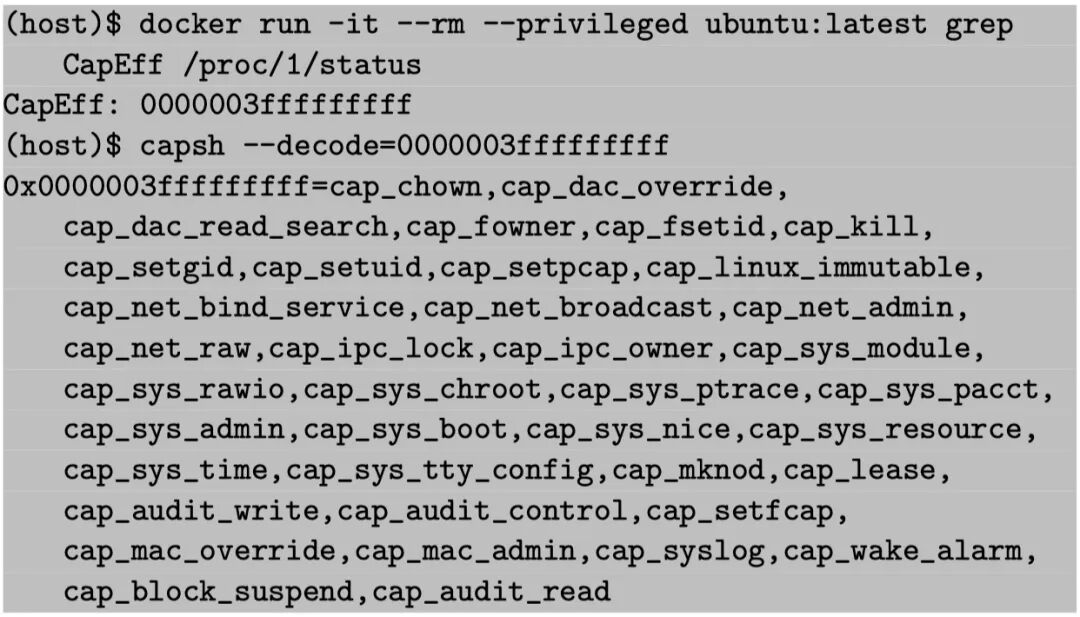 特权模式检查:对于容器内的攻击者来说,特权模式几乎就意味着容器逃逸。如下图所示,特权模式意味着容器内进程将具备等同于宿主机上进程的所有权限: