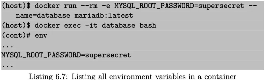 环境变量读取:环境变量本身是一种常用的宿主机与容器的通信方式。然而,作为容器内的攻击者,他同样获得环境变量中可能存在的敏感信息,从而扩大战果,如借助环境变量设置数据库访问凭证的场景: