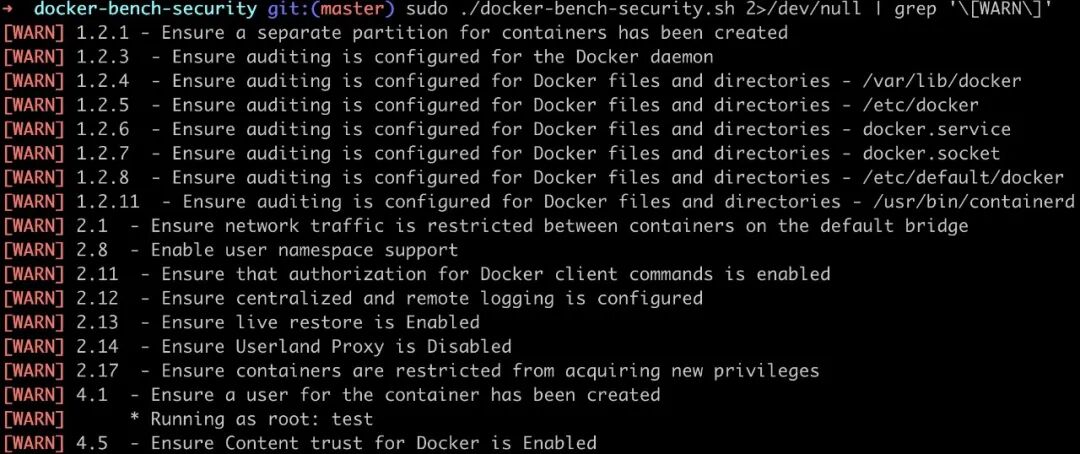 操作:运行Docker Bench for Security项目[1]来快速发现安全缺陷。笔者在本地环境下的部分测试结果如下图所示: