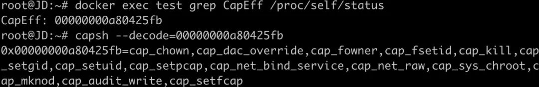 操作:执行grep CapEff /proc/self/status获得权限值,在其他系统上执行capsh --decode=value将前面获得的值解析为具体权限。例如: